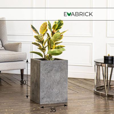 Кашпо напольное «Evabrick Cube» из полимербетона для цветов и декоративных растений объёмом 51 литр, размером 50 на 35 см, весом 14 кг, в форме куба серого цвета.