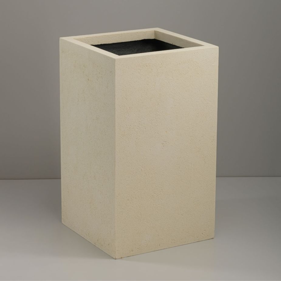 Кашпо напольное «Evabrick Cube» из полимербетона для цветов и декоративных растений объёмом 62 литра, размером 60 на 35 см, весом 17 кг, в форме куба бежевого цвета.