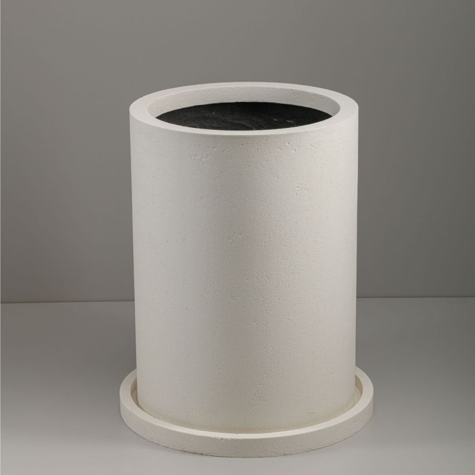Кашпо напольное «Evabrick Cylinder» из полимербетона для цветов и декоративных растений объёмом 56 литров, размером 55 на 40 см, весом 21 кг, в форме цилиндра белого цвета с поддоном.
