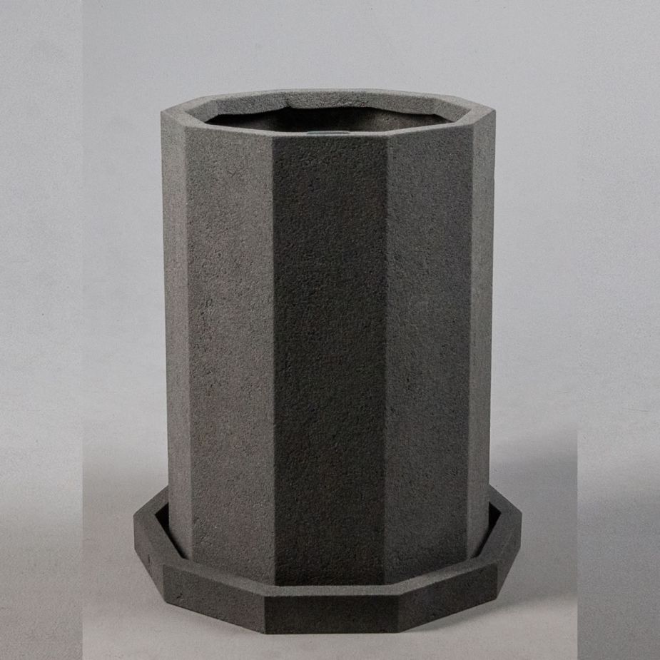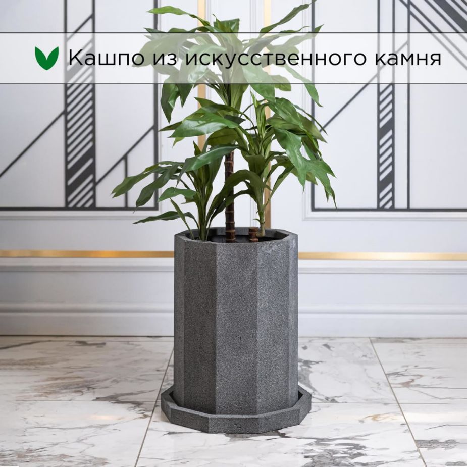 Кашпо напольное «Evabrick Prizma» из полимербетона для цветов и декоративных растений объёмом 30 литров, размером 40 на 30 см, весом 11 кг, в форме призмы серого цвета с поддоном.