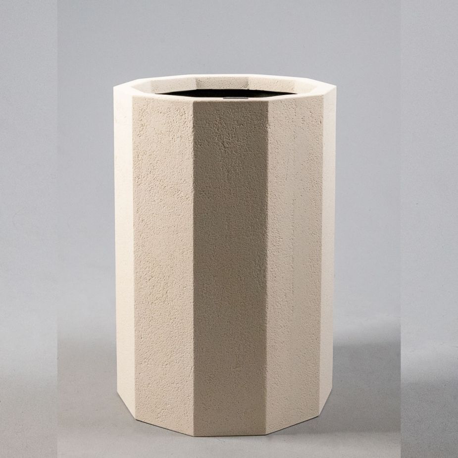 Кашпо напольное «Evabrick Prizma» из полимербетона для цветов и декоративных растений объёмом 36 литров, размером 50 на 35 см, весом 12 кг, в форме призмы бежевого цвета.