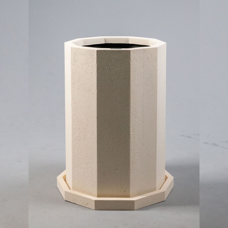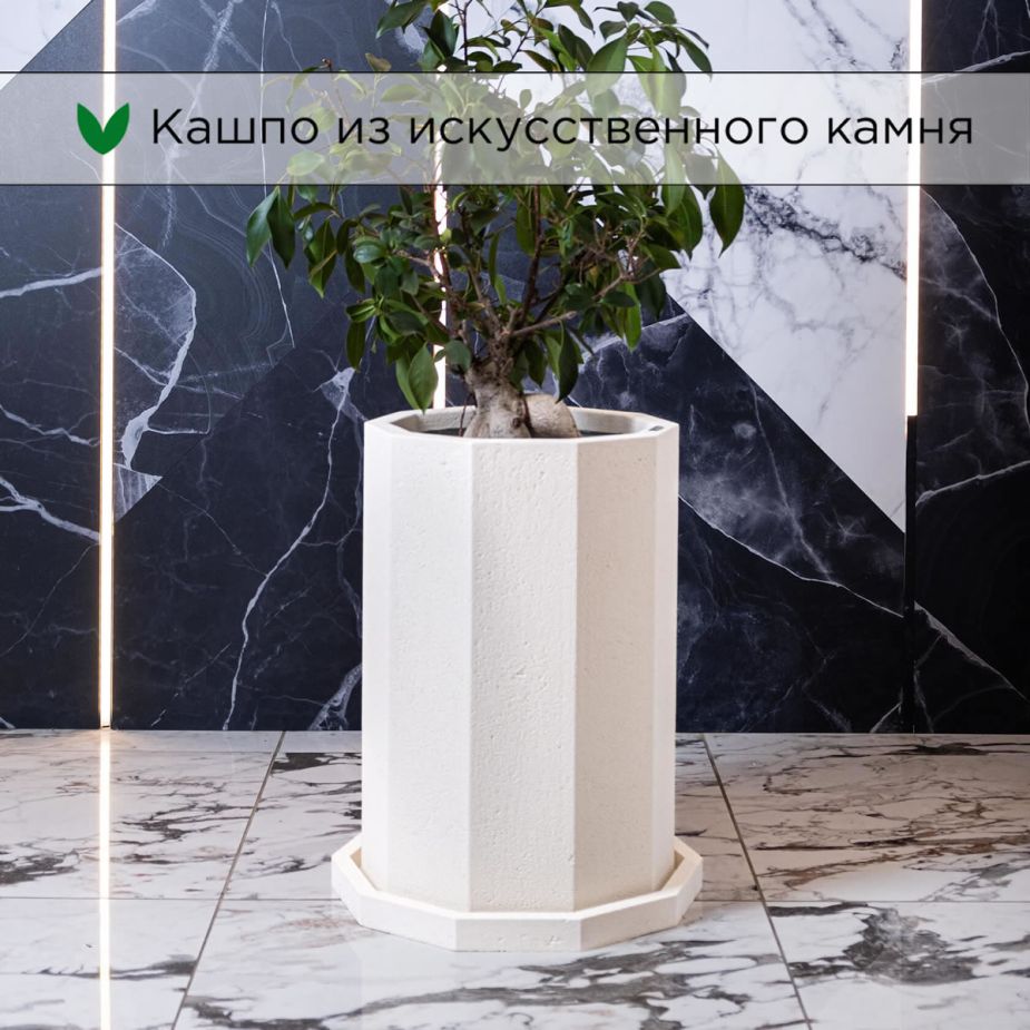 Кашпо напольное «Evabrick Prizma» из полимербетона для цветов и декоративных растений объёмом 36 литров, размером 50 на 35 см, весом 15,5 кг, в форме призмы бежевого цвета с поддоном.