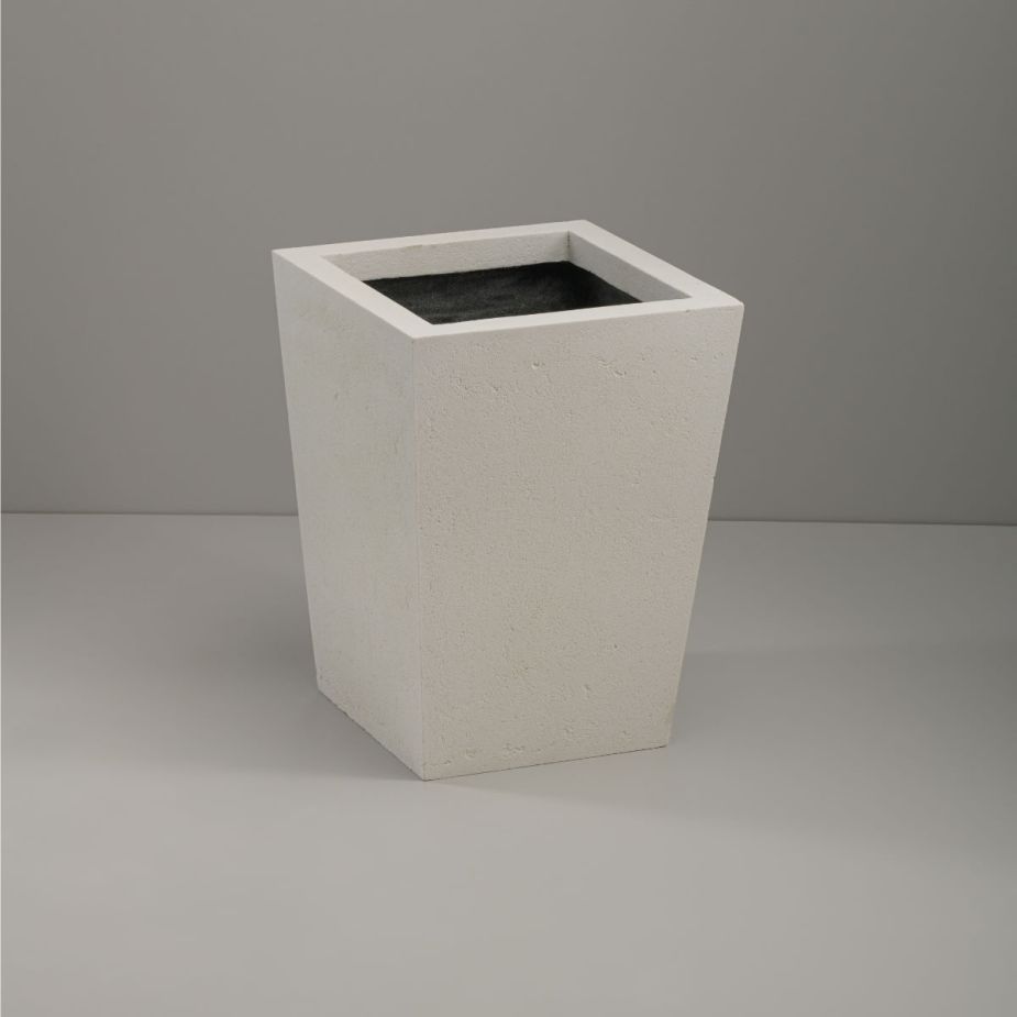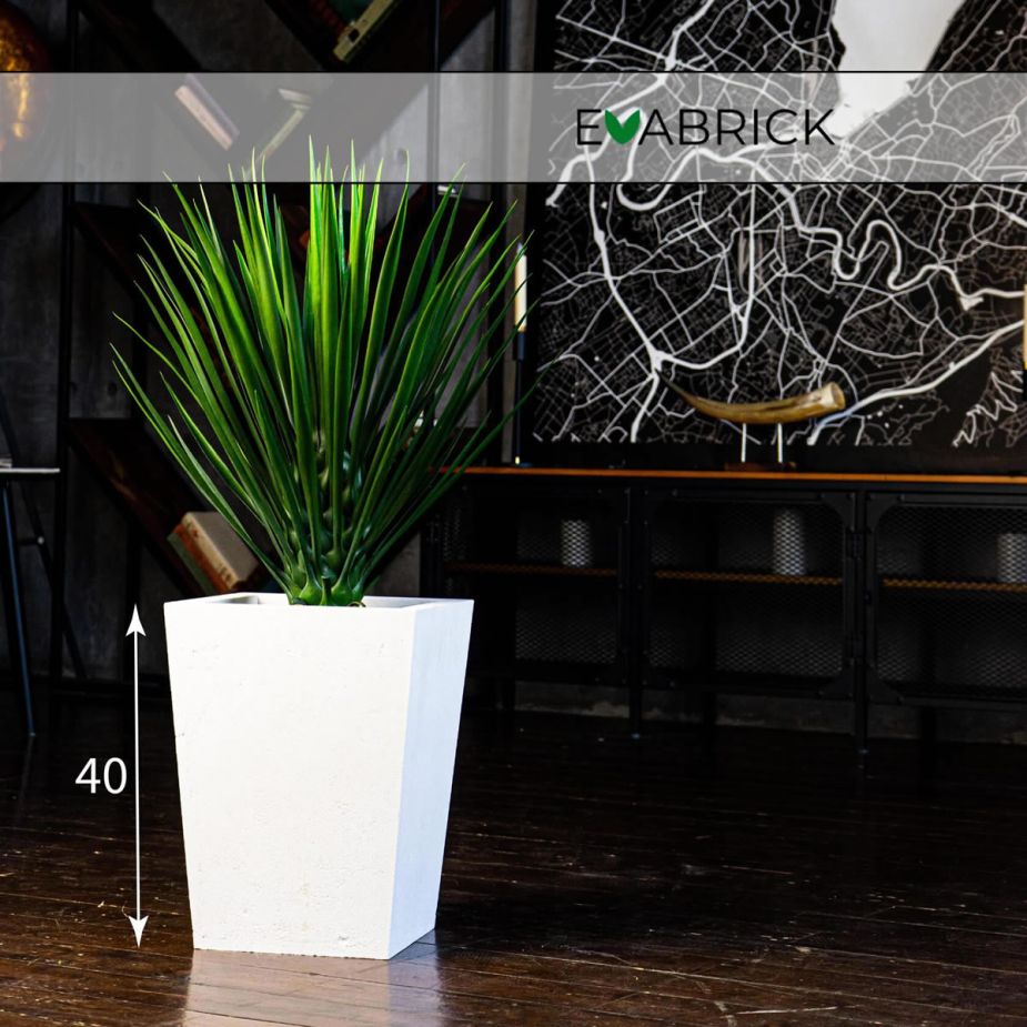 Кашпо напольное «Evabrick Pyramid» из полимербетона для цветов и декоративных растений объёмом 22 литра, размером 40 на 30 см, весом 8 кг, в форме пирамиды белого цвета.